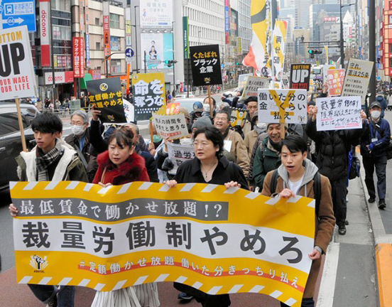 Hundreds marched against the expansion of the “discretionary working system”, in which workers are paid for a predetermined set number of hours rather than the actual time worked, in front of JR Shinjuku Station in Tokyo on Feb. 25,Nikkei reported. Banners and placards were waved as protesters chanted, “Do not make us work overtime, every day, every night,” in the demonstration held by Aequitas, a grass-roots association that has been calling for an increase in the minimum wage. Prime Minister Shinzo Abe’s administration is planning to expand the existing system to have more people work under discretionary labor contracts that factor in a predetermined number of hours, but do not pay for additional hours worked beyond that. Abe has argued that the reforms would reduce overwork by enabling employees on discretionary contracts to work more flexible hours. Opposition camps are arguing against that change at the current Diet session on the basis that the data cited by Abe turned out to be inappropriate.